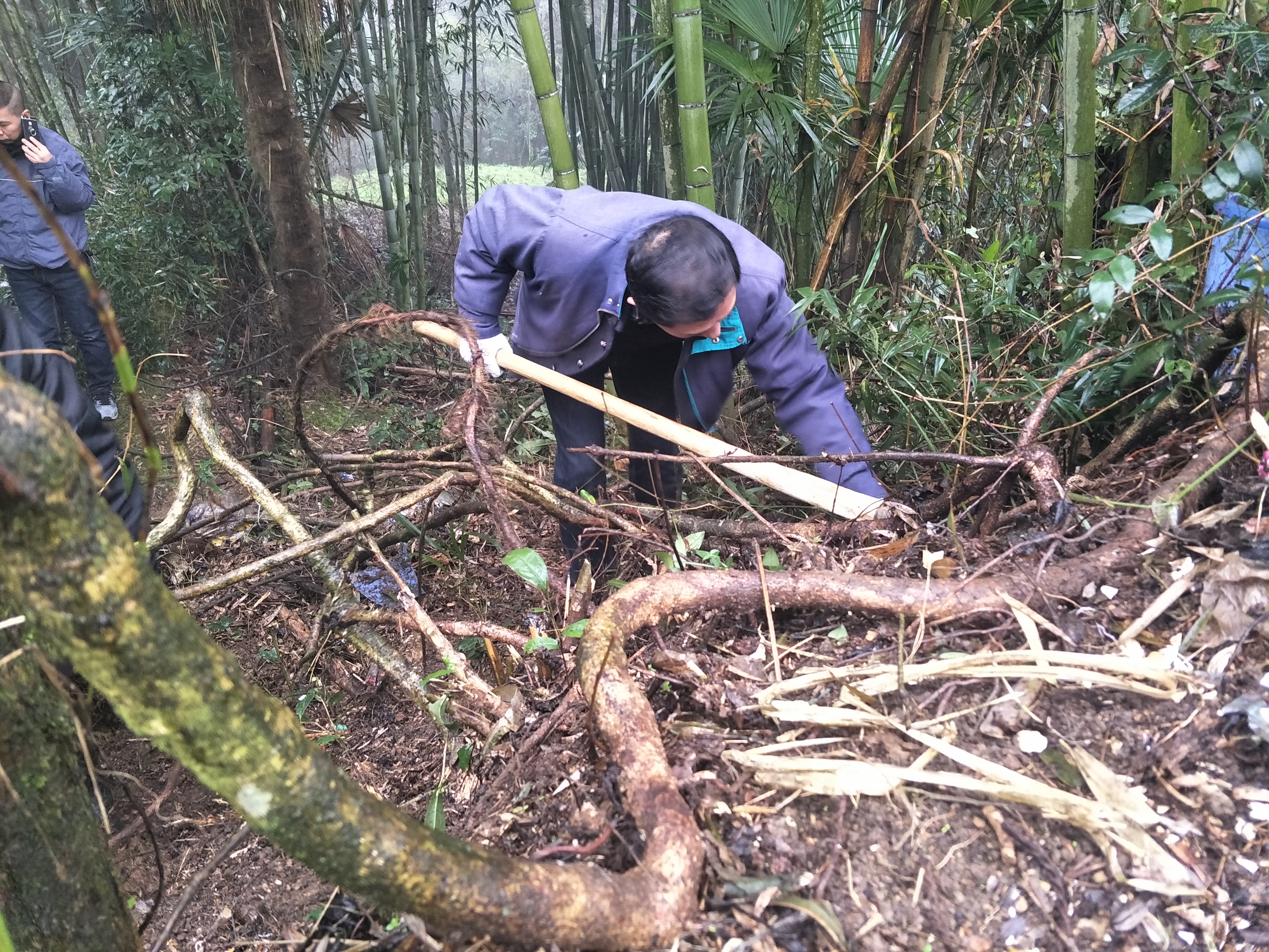 ?經(jīng)過一番修枝清理便開始動(dòng)土挖根,為了保護(hù)好這棵老樹根的完整及植物的適應(yīng)度,樹根上保留了些許當(dāng)?shù)氐哪嗤?,再給其添了幾袋泥土帶回備用。數(shù)百年的生長(zhǎng),根深蒂固,替這棵“莓茶藤王”遷徙是一項(xiàng)比較大的工程,四五人耗費(fèi)許大一番功夫才將其完全從這片土地請(qǐng)出來,再將其藤枝繞圈卷好,四人合力幫抬將其運(yùn)出大山。